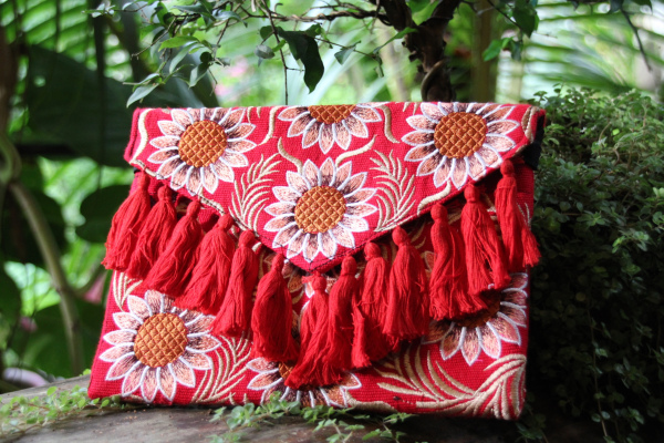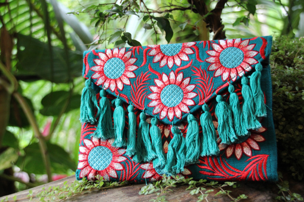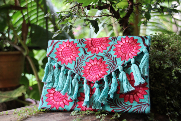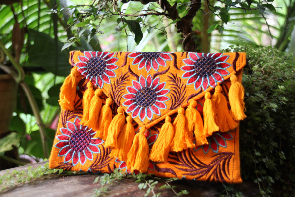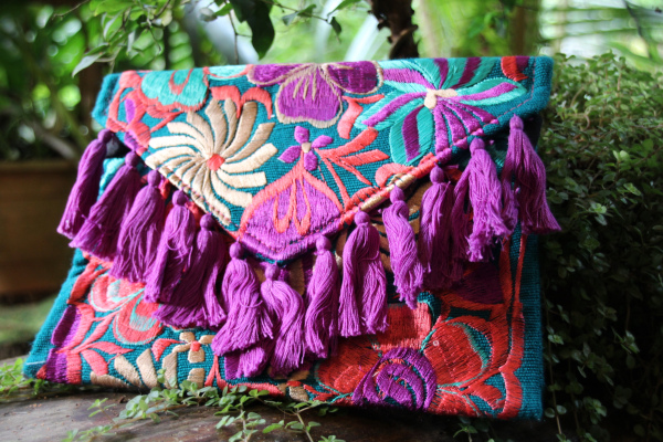 Bolsos tejidos a mano por artesanos de Guatemala. Cartera grande tejida con patrones coloridos y borlas decorativas tipo sobre con tira para colgar.